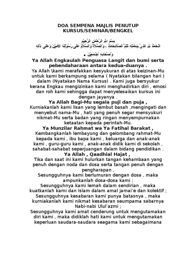 Doc doa sempena majlis penutup kursus dzul hilmi mohd jani academia edu . Doa ini saya cerakinkan untuk menambah ejaan rumi kerana majoriti pembaca panduan ini sukartidak mahir membaca tulisan arab.